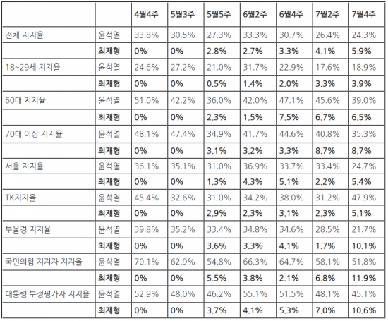 분석 대상은 본지가 의뢰해 실시한 4월4주, 5월3주, 5월5주, 6월2주, 6월4주, 7월2주, 7월4주 등 총 7개 조사 결과입니다. 설문 항목은 거론되는 대선후보 12명을 불러주고 지지 후보를 고르게 한 것입니다. 아래 표는 각 조사 때 윤 전 총장이 받은 지지율입니다.