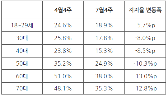 세간의 관심을 받으며 검찰총장에서 물러난 직후인 4월, 60대 이상 연령층의 절반이 그를 지지했었습니다. 거의 압도적 지지세라 볼 수 있습니다. 당시 조사에서 다른 연령대는 24%(18~29세), 높아야 35%(50대) 수준이었습니다. 그런데 6.29 선언 이후 가파른 하락세를 보입니다. 이것은 60,70대만의 현상일까요 아니면 전 연령대에서 비슷하게 나타난 현상일까요. 다음 표는 첫 조사와 마지막 조사의 지지율 변동치를 연령대 별로 비교해본 것입니다.