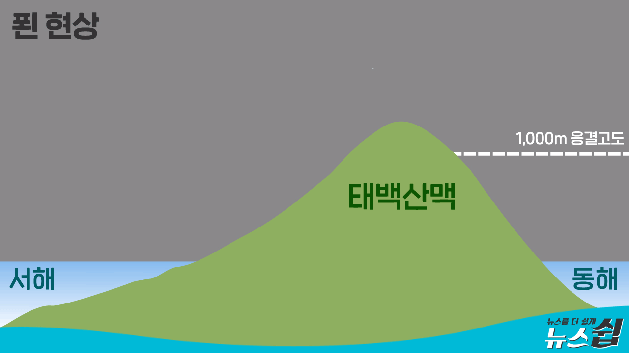 동해안에서 불어오는 바람이 해발 1천 미터 이상 산맥을 넘으면서 품고 있던 수증기를 빗방울로 응결시켜 떨어뜨리고, 서쪽으로 하강하면서는 고온건조한 바람으로 변하는 것이 푄 현상이다.