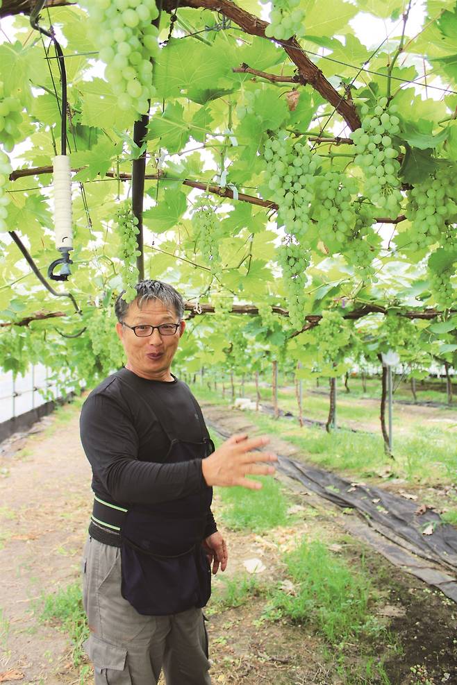 "포도 농사를 지은 지는 한 35년 정도 됐는데, 세기 무핵은 한 6~7년 됐지. 원래 친환경으로 재배할 수 있는 씨 없는 포도로 경조종이라는 품종이 있었는데 그건 알이 작았어. 그래도 소비자들은 나오기만 하면 냉장고에 쟁여놨던 품종이여. 근데 세기 무핵이 같은 조건으로 알이 더 크니까 이거로 바꿨는데, 이제는 그거로 모자라서 엄청 큰 걸 원하잖어, 다들."