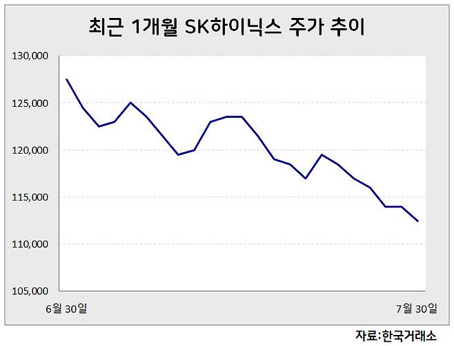 31일 한국거래소에 따르면 지난 30일 SK하이닉스는 전거래일보다 1500원(1.32%) 하락한 11만2500원에 거래를 마쳤다. 이달 중순까지만 해도 12만원선을 지키던 주가는 최근 10거래일 가운데 무려 8거래일이 하락마감하며 11만원선 마저도 무너질 위험에 처했다.