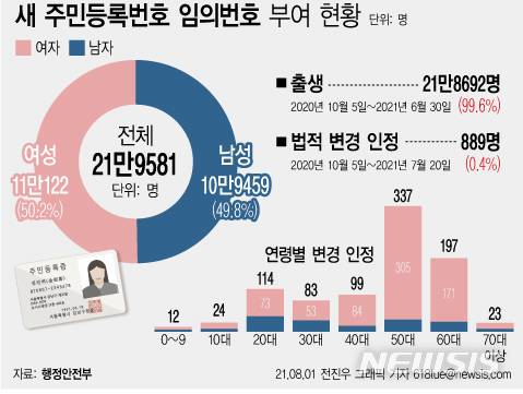 출생으로 인해 주민등록번호를 새로 부여받은 인원이 21만8692명(99.6%)으로 대부분을 차지했다.