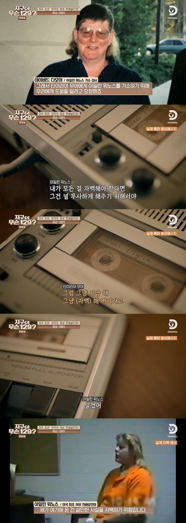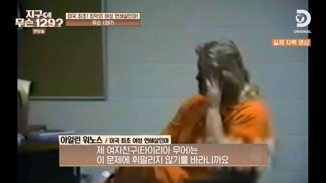 결국 아일린 워노스는 "널 너무나 사랑해. 내가 모든 걸 자백해야 한다면 그건 널 무사하게 하기 위해서야. 걱정하지 마 알았지?"라는 말을 남긴 후, 통화를 끊자마자 경찰 취조실을 찾아가 자백을 했다고 알려져 놀라움을 줬다. (사진= 디스커버리 채널 코리아, NQQ '지구에 무슨 129?')