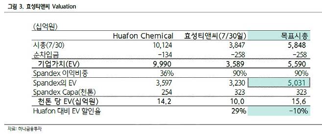 윤재성 하나금융투자 연구원은 “동사의 2분기 영업이익은 사상 최대치로, 상향된 시장 전망치를 19% 웃돌았다”며 “스판덱스·PTMG(폴리테트라메틸렌에테르글리콜) 영업이익이 전년 동기 대비 76% 급증했기 때문”이라고 설명했다.