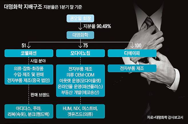 대명화학은 지주회사 역할을 하며, 사업 분야는 크게 패션과 전자로 나뉜다. 코웰패션은 의류와 잡화, 화장품 제조 및 판매 등 패션 사업에 치중하고 모다이노칩은 전자 사업과 유통 사업을 함께한다. 모다이노칩은 스마트폰과 자동차 전장, 스마트TV, 노트북에 들어가는 세라믹 수동부품을 납품하는 전자 사업과 오프라인 아웃렛 사업과 온라인 유통(패션플러스), 부동산 투자·개발을 담당한다. 의류 브랜드 닉스(NIX), 겟유즈드를 보유한 케이브랜즈도 계열사로 두고 있다. 작년 말 기준 계열사만 30개다. 얼핏 큰 상관이 없어 보이는 패션과 전자가 대명화학이라는 한 울타리에 놓인 건 전적으로 권 회장의 투자 스타일 때문이다.