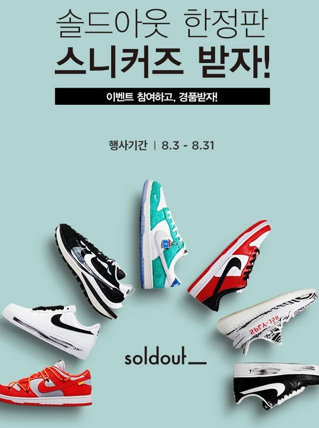 3일 편의점 이마트24는 무신사가 만든 '솔드아웃'과 손잡고 최고 100만원 상당의 스니커즈 경품을 내걸었다. 이날부터 31일까지 삼각김밥, 김밥, 샌드위치, 햄버거를 먹고 이마트24 모바일 앱에서 응모하면 추첨 번호를 받을 수 있다. '솔드아웃' 앱에 이를 입력하면 9월10일 무작위 추첨을 통해 최대 50만~100만원 상당 한정판 스니커즈를 경품으로 지급한다.