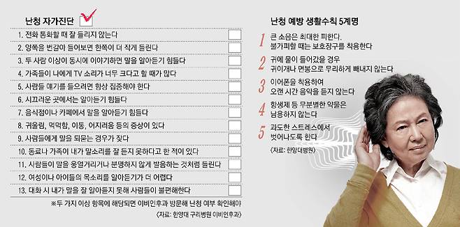 일상 생활에서 난청을 예방하려면 우선 소음에 노출되는 상황을 피하는 게 중요하다. 버스나 지하철 등 시끄러운 환경에서 음악 감상은 가급적 피한다. 어쩔 수 없는 상황이면 귀마개를 하고 귀가 쉴 수 있도록 충분한 휴식시간을 준다. 항생제나 항암제, 소염제 중 일부 약물은 난청의 원인이 될 수 있어 반드시 의사 처방을 받아 복용한다.