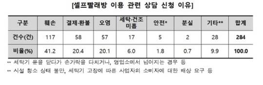 4일 한국소비자원에 따르면 '1372소비자상담센터'에 신청된 셀프빨래방 관련 상담은 지난해 87건으로 2016년(28건)보다 3.1배 증가한 것으로 나타났다. 5년간 셀프빨래방 관련 소비자 상담 건수는 284건으로 집계됐다.