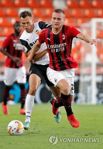 epa09395769 Valencia's Denis Cheryshev (L) in action against AC Milan's Tommaso Pobega (R) during the friendly match between FC Valencia and AC Milan in Valencia, Spain, 04 August 2021. EPA/Ana Escobar