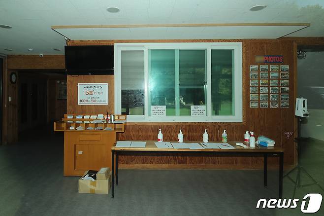 (대구=뉴스1) 공정식 기자 = 대구에서 신종 코로나바이러스 감염증(코로나19) 신규 확진자가 121명이 발생한 5일 다수의 확진자가 나온 수성구 욱수동의 한 교회 유리창 너머로 출입기록 작성대와 손 소독제 등 방멱물품이 보이고 있다. 2021.8.5/뉴스1