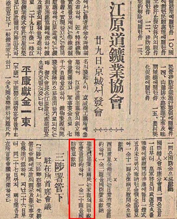 | ▲ 해림에서 애국기2기에 해당하는 금액을 헌납했다는 매일신보 기사(1945. 3. 29) 해림가 부가장과 조선거류민단장이 당시 하는 일은 국방헌금이나 애국기 헌납금을 잘 걷는 일, 방공훈련에 주민들 잘 동원하는 일, 일제의 중국침략을 비롯한 '대동아전쟁(아시아-태평양전쟁)'의 정당성을 선전하는 창구역할을 잘하는 일 등이었다. |