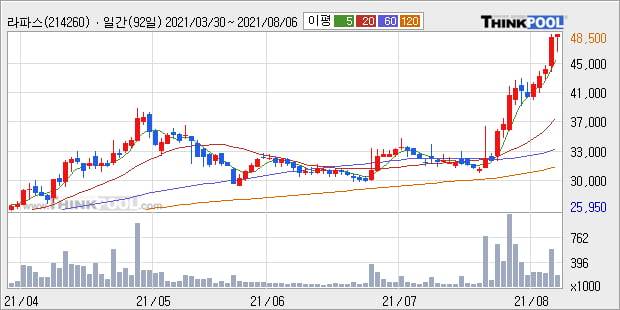 '라파스' 52주 신고가 경신, 단기·중기 이평선 정배열로 상승세