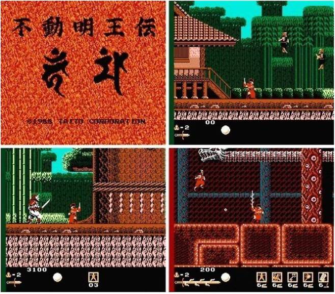 꿀딴지곰 : 타이토의 명작 타이틀 '영의 전설'의 게임성과 모티브를 그대로 따와서 장편으로 제작한 듯한 패미콤 용 횡스크롤 액션 게임 '부동명왕전'도 스토리는 비슷합니다. 사실상 영의 전설의 후속작이라고 해도 과언이 아닌 본 작품은 보장받은 전작의 게임성이 그대로 장점으로 살아 있는 수작 게임인데요,