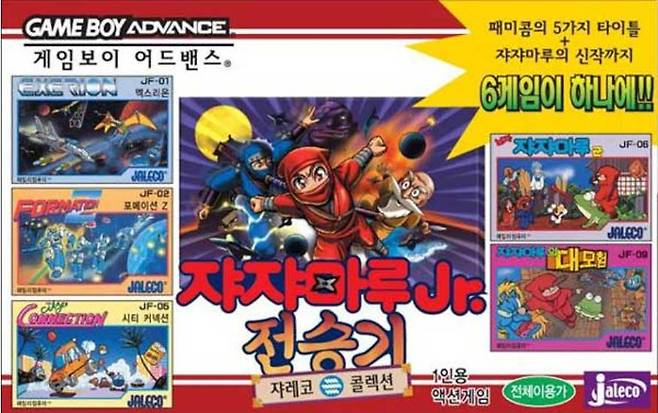 '쟈쟈마루' 시리즈의 아들인 '쟈쟈마루 주니어'가 수리검으로 악당들을 무찌르며 메기에게 납치된 사쿠라 공주를 구한다는 내용으로 되어 있죠. 이 외에도 전작인 '닌자 쟈쟈마루군'과 '쟈쟈마루의 대모험' 및 슈팅 게임 '엑스리온' '포메이션Z', 레이싱 게임 '시티 커넥션' 등 5개의 고전 게임이 함께 수록되어 상당히 인기가 있었습니다. 예전엔 쌌는데 슬슬 가격이 오르고 있더군요.
