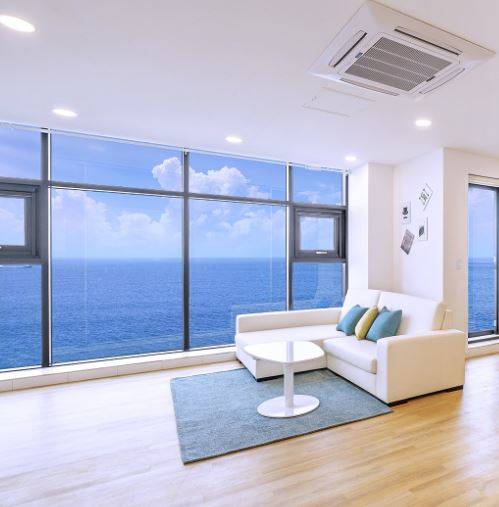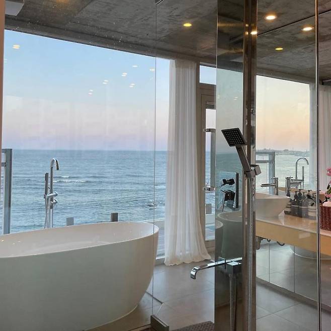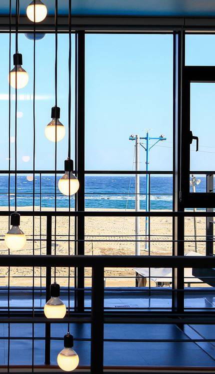 보기만 해도 ‘오션뷰 치료’ 그 자체. 바다는 원 없이 느낄 수 있다는 ‘테라스 마크’는 테라스까지 갖췄다. 모든 방이 아름다운 동해해변을 볼 수 있지만, 이곳의 절정은 5층의 독실. 그야말로 어디서나 영진 해변이 보이는 객실에서는 간단한 조리가 가능한 주방, 미니멀한 욕조가 있는 욕실, 침실까지 파도가 일렁이는 해변뷰를 보장한다. 프레임 없는 깔끔한 유리 난간, 노출 콘크리트 등의 미니멀한 인테리어는 숙소 곳곳에 놓인 소품들과 어우러져 감성 샷을 남기기에 부족함이 없다.