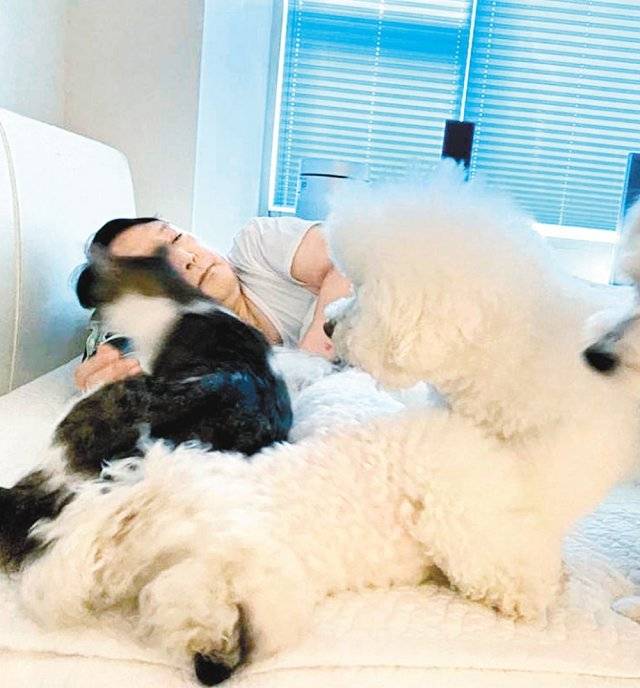 | 반려견과 휴가 즐기고 윤석열 전 검찰총장이 휴가 이틀째인 6일 반려견 4마리가 뒹굴고 있는 침대에서 흰색 러닝셔츠 차림으로 누워 있다. 윤 전 총장 반려동물 인스타그램 캡처 |