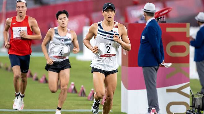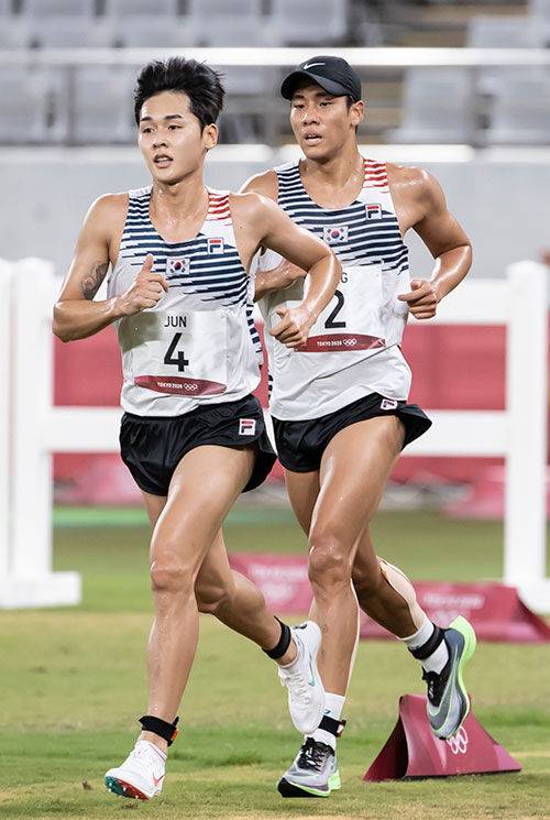 한국 전웅태와 정진화가 7일 일본 도쿄스타디움에서 열린 도쿄올림픽 남자 근대5종 레이저런 경기를 펼치고 있다.