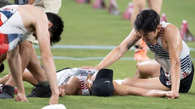 결승선 통과 후 숨을 고르고 있는 정진화(왼쪽)와 전웅태