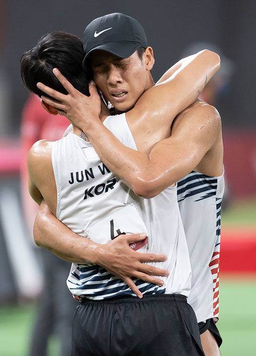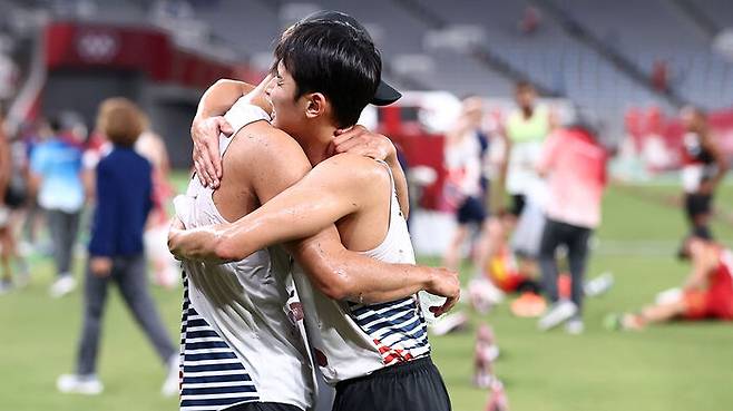 일본 도쿄스타디움에서 열린 도쿄올림픽 남자 근대5종 레이저런 경기에서 한국 전웅태와 정진화가 결승선을 통과한 후 포옹하고 있다.