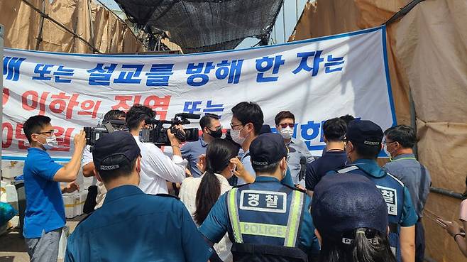 교회 측 강연재 변호사는 "강제조사를 하려면 영장을 들고 오라. 법적 근거와 공문 없이 강요하는 것은 정당한 공무집행이 아니다"라며 언성을 높였습니다.