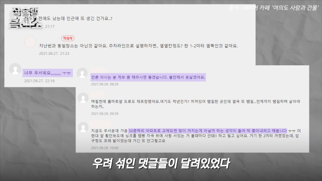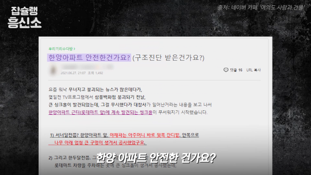 지난 6월, 여의도 지역 커뮤니티에는 ‘한양 아파트 안전한 건가요?'라는 제목의 게시글이 올라왔다. 해당 게시글엔 올해 3월 경부터 발생한 세 차례의 싱크홀 발생 경위가 정리되어 있었다. 게시글 작성자에 의하면, 첫 번째 싱크홀은 롯데마트 인근 잔디밭 나무 아래 발생했다. 두 번째 싱크홀은 첫 번째 싱크홀 발생 지점 인근인 롯데마트 주차장에서 발생했다. 세 번째 싱크홀은 앞선 두 싱크홀로부터 약 1~2m 거리를 두고 발생했다. 싱크홀 아래 구멍이 넓어 보였다고 묘사한 작성자는 “약 1m의 거리를 두고 6개월 동안 세 차례 연속으로 싱크홀이 발견된 것은 구역 전체에 문제가 있다는 것 아니냐”고 하소연했다. 덧붙여 싱크홀 발생 원인과 아파트의 지반 안정성이 궁금하다고 주장했다.