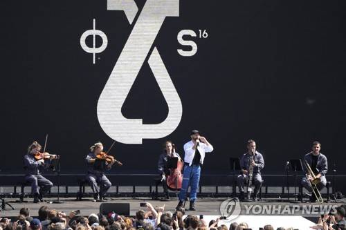 Spectators watch as Woodkid performs onstage at the the Olympics fan zone in the Trocadero Gardens in front of the Eiffel Tower in Paris, Sunday, Aug. 8, 2021. Celebrations were held in Paris Sunday as part of the handover ceremony of Tokyo 2020 to Paris 2024, as Paris will be the next Summer Games host in 2024. The passing of the hosting baton will be split between the Olympic Stadium in Tokyo and a public party and concert in Paris. (AP Photo/Francois Mori)