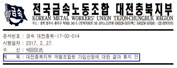 | ▲ 북의 지령을 받아 지역 대기업등과 민주노총 인사를 포섭하라는 지령을 받았다고 전해진 A씨. 그는 2016년 민주노총 소속 금속노조에 조합원 가입신청을 했다. 금속노조는 A씨가 조직력을 훼손할 우려가 있다며 이를 거부했다. 사진은 금속노조가 A씨에게 보낸 공문 |