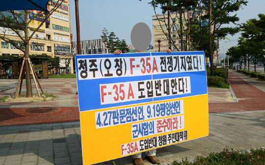 | ▲ 지난 2일 북한의 지령을 받아 F-35 스텔스기 도입반대 운동을 펼친 혐의로 청주 등지에 에서 활동하던 3인이 구속됐다. 사진은 이들이 전개한 1인 시위 모습 |