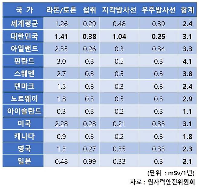 이런 자연 방사능을 평균적으로 계산해보면, 한국인의 경우 1년에 3.1mSv의 방사선을 받는다고 합니다.