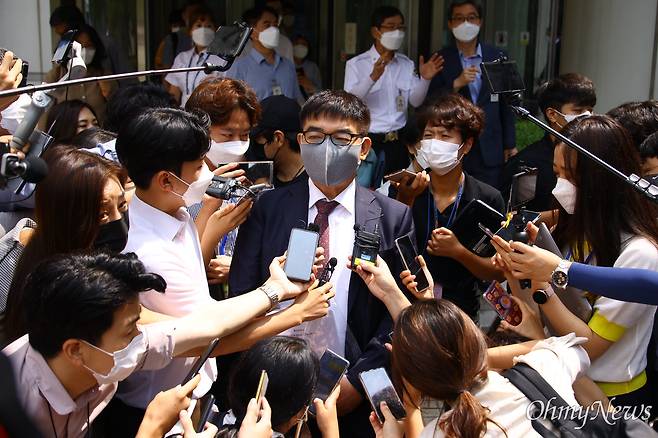 | ▲ 정경심 동양대 교수의 변호를 맡은 김칠준 변호사가 11일 서울 서초구 서울고등법원에서 열린 정 교수의 선고심을 마치고 나와 기자들의 질문에 답변하고 있다. |