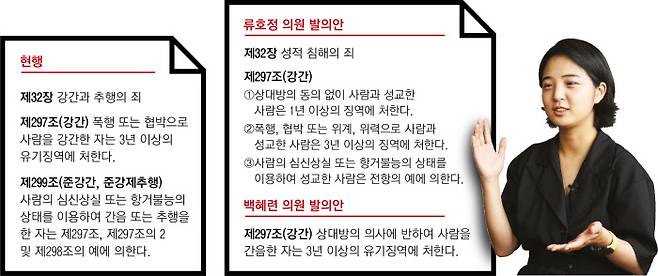 류 의원은 지난해 8월12일 강간죄 개정안을 발의했다. 형법 제32장의 제목을 ‘강간과 추행의 죄’에서 ‘성적 침해의 죄’로 바꾸고, 강간·추행죄의 구성요건에 상대방의 동의 여부와 위계·위력을 추가했다. 류 의원의 발의안에 함께한 의원은 본인 포함 13명이었다. 이번 친전 응답 수와 비슷하다.