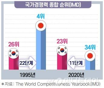 12일 전경련에 따르면 스위스 소재 국제경영개발연구원(IMD)이 거시경제와 정부·기업 효율성, 보건환경·교육 인프라 등을 분석해 국가경쟁력을 종합 평가하는 IMD 국가경쟁력 순위에서 한국이 올해 평가 대상 64개국 가운데 23위, 일본은 31위에 올랐다. 1995년 한국 26위, 일본 4위였던 순위가 한세대만에 역전됐다.