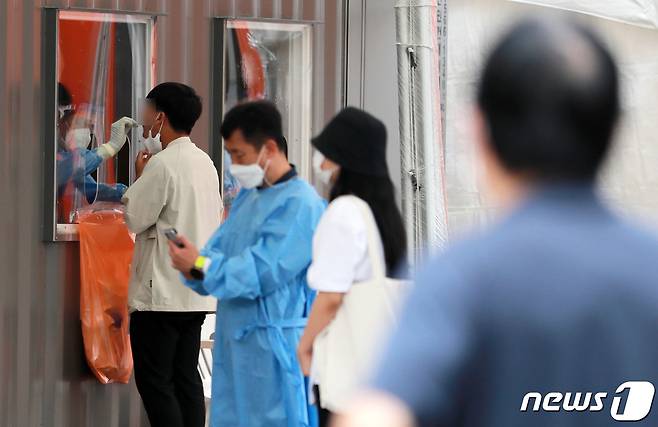 (서울=뉴스1) 구윤성 기자 = 신종 코로나바이러스 감염증(코로나19) 확산이 이어지는 12일 오후 서울 서대문구 홍제견인차량보관소에 마련된 코로나19 임시선별검사소에서 시민들이 검사를 받기 위해 대기하고 있다. 2021.8.12/뉴스1