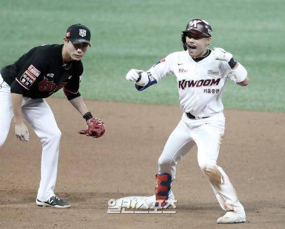 2021프로야구 KBO리그 키움히어로즈와 kt위즈의 경기가 12일 오후 서울 고척스카치돔에서 열렸다. 8회말 2사 2,3루 이용규가 역전 2타점 적시타를 치고 2루까지 뛰어 세이프한 후 환호하고 있다.