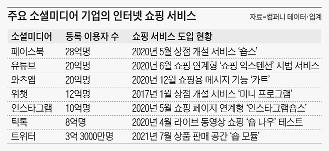 소셜미디어 기업 트위터는 지난달 28일 쇼핑 기능을 전격 도입했다. 트위터의 기업용 서비스에 가입한 기업 자사 트위터 페이지(프로필)에 제품을 선보일 수 있는 전용 공간인 ‘숍 모듈’을 마련해 트위터 사용자들이 상품을 살펴보고 결제까지 할 수 있게 했다. 페이스북도 지난해 5월부터 기업 가입자가 자사 페이스북 페이지에서 상품을 팔 수 있는 ‘숍스(Shops)’ 운영을 시작했다. 현재 운영 중인 숍스 상점은 120만개로, 월간 방문객 수는 3억명을 넘겼다. 페이스북은 자회사인 인스타그램에도 쇼핑 전용 페이지 ‘인스타그램 숍스’를 도입했고, 해외 대표 메신저 앱인 와츠앱(WhatsApp)에도 작년 12월부터 ‘카트’라는 쇼핑 기능을 적용했다.