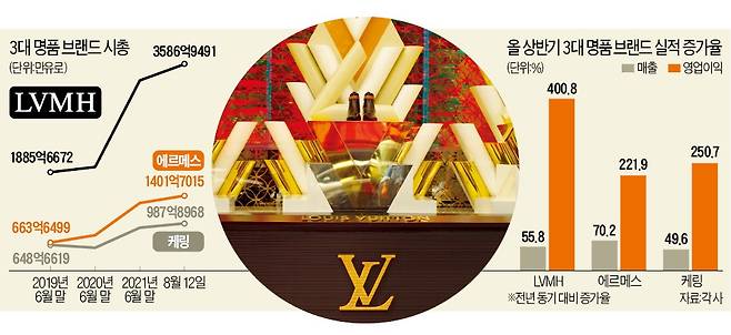 올 상반기 LVMH그룹의 패션·가죽 제품 부문 매출만 188억6300만유로다. 케링그룹 전체 매출(80억4700만유로)과 에르메스 매출(42억3500만유로)을 합쳐도 130억유로 수준이다. 전년 동기 대비 영업이익 증가율 역시 에르메스(221.9%)와 케링(250.7%)을 뛰어넘었다.
