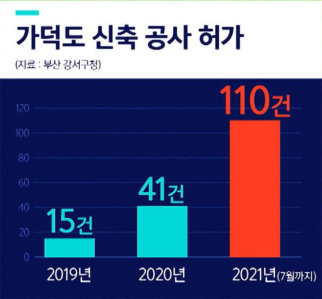 부산 강서구청에서 올해 가덕도 동에 허가한 신축 공사 건수는 지난 7월까지만 해도 벌써 110건입니다. 지난해는 41건, 재작년에는 15건에 불과했습니다. 올해가 다섯 달이나 남았다는 걸 생각하면 그야말로 폭증했습니다.