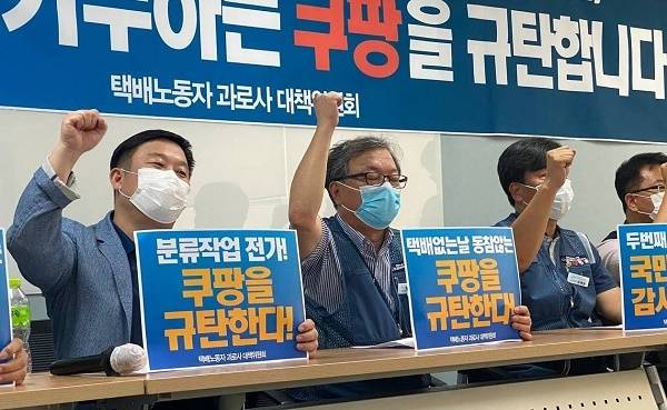 택배 과로사 대책위가 '택배 없는 날(8월 14일)' 맞아 이를 거부한 쿠팡을 향해 '택배없는 날'과 사회적합의 동참을 촉구했다.
