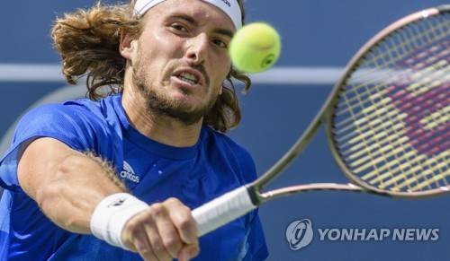 epa09414348 Stefanos Tsitsipas of Greece in action against Reilly Opelka of the US during the semifinals of the National Bank Open men's tennis tournament in Toronto, Canada, 14 August 2021. EPA/WARREN TODA