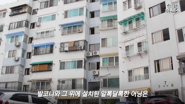 고개를 들어 아파트를 보면 곧바로 색색깔의 발코니 어닝이 눈에 들어온다. 현대 우리나라 아파트에서는 잘 찾아볼 수 없는 발코니와 그 위에 설치된 알록달록한 어닝은 낡은 아파트에 독특한 분위기와 생기를 부여하고 있다.
