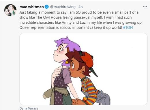 현재 디즈니 채널 애니메이션 시리즈 ‘아울 하우스’에 출연하고 있는 그는 17일 트위터에 “‘아울 하우스’에 출연하는 것이 너무 자랑스럽다. 내 자신이 범성애자이기 때문에 어렸을 때부터 아미티나 루즈 같은 훌륭한 캐릭터들이 있었으면 좋겠다고 생각했다. 퀴어 표현은 매우 중요하다. 세상과 일치하라#TOH"라고 썼다.
