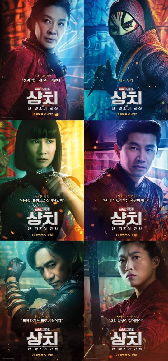 개봉 확정과 함께 공개된 6인 캐릭터 포스터 역시 시선을 집중시키며 기대감을 더욱 상승시킨다. 샹치(시무 리우)는 "난 네가 생각하는 사람이 아냐"라는 대사와 함께 어둠을 딛고 마블의 새 시대를 열 슈퍼 히어로로서 자신의 각오를 드러내 그의 앞에 펼쳐질 거대한 서사에 궁금증을 야기시킨다. "피의 대가는 피로 치러야지"라는 잔혹한 대사와 함께 대체불가한 압도적 존재감을 내뿜는 웬우(양조위)의 모습 역시 인상적이다. 텐 링즈의 엄청난 힘을 예고하는 그의 모습을 통해 샹치와 웬우의 맞대결이 어떻게 펼쳐질지 궁금증을 유발한다.