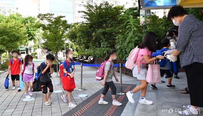 일선 학교의 2학기 개학이 본격적으로 시작되는 17일 오전 서울 시내 한 초등학교에서 1~2학년 학생들이 등교하고 있다. / 사진공동취재단