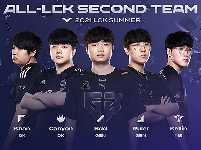 세컨드 팀에는 담원 기아의 탑 라이너 '칸' 김동하와 정글러 '캐니언' 김건부, 젠지의 미드 라이너 '비디디' 곽보성과 원거리 딜러 '룰러' 박재혁, 농심 레드포스의 서포터 '켈린' 김형규가 이름을 올렸다.