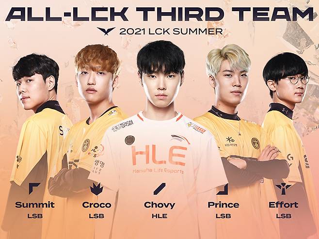 서드 팀에는 이번 서머에 ‘모래 바람’을 일으킨 리브 샌드박스 주전들이 대거 포진했다. 탑 라이너 '써밋' 박우태, 정글러 '크로코' 김동범, 원거리 딜러 '프린스' 이채환, 서포터 '에포트' 이상호가 선정됐고 미드 라이너로는 한화생명e스포츠의 '쵸비' 정지훈이 선정됐다.