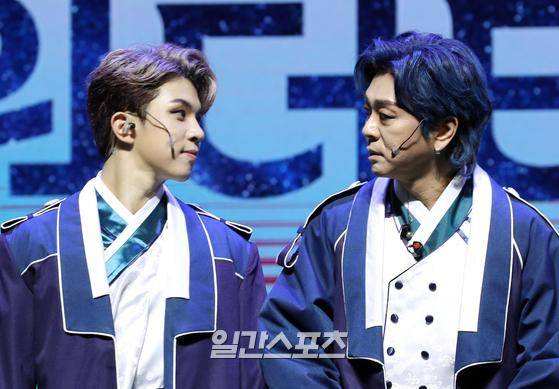 엔플라잉(N.Flying) 멤버 유회승과 윤도현이 17일 오후 서울 용산구 한남동 블루스퀘어 마스터카드홀에서 열린 뮤지컬 '원더티켓-수호나무가 있는 마을' 프레스콜을 마친 후 전 출연진과 포토타임을 갖고 있다.