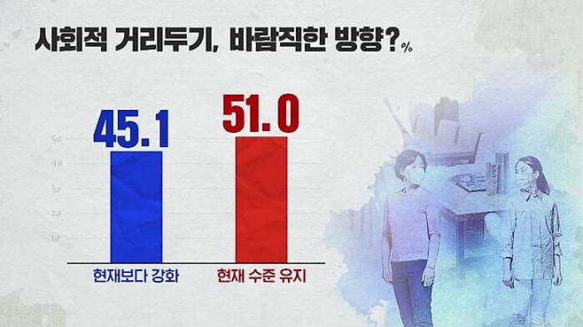 신규 확진자 2천 명 안팎의 코로나 4차 대유행 시대, 사회적 거리두기 강화 여부를 물었더니 현재보다 강화 45.1%, 현재 수준 유지 51%로 조사됐습니다.
