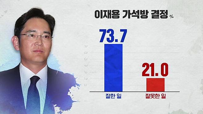 이재용 삼성전자 부회장 가석방 결정에 대해서는 '긍정 평가' 73.7%, '부정 평가' 21%로 조사됐습니다.