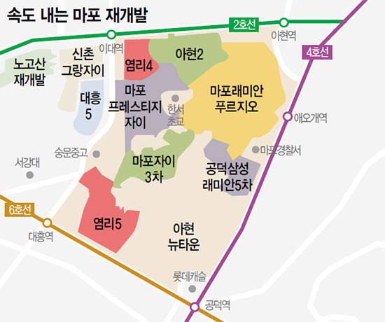 현재 마포구에서 새롭게 재개발 사업을 추진하는 곳은 염리4구역과 염리5구역, 또 노고산구역(가칭) 등이다. 아현뉴타운 서쪽에 있는 염리4·5구역은 아현뉴타운의 ‘마지막 퍼즐’로 불린다. 두 구역은 2015년 뉴타운구역에서 해제됐다. 하지만 주변 집값이 크게 오르자 지역 주민들이 자체 추진위원회를 꾸려 재개발에 나서고 있다.