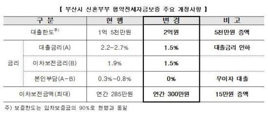 또 부산은행이 대출금리를 낮춰 1.5% 수준으로 운영하고, 부산시가 1.5%포인트의 이자를 신혼부부에게 지원한다.